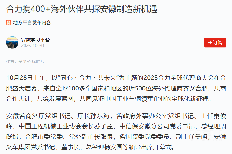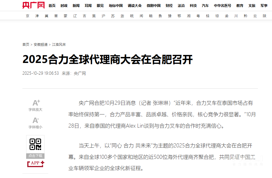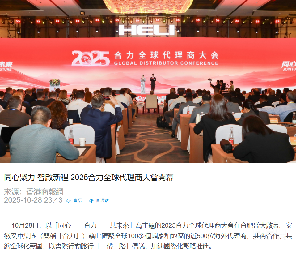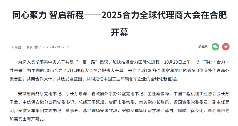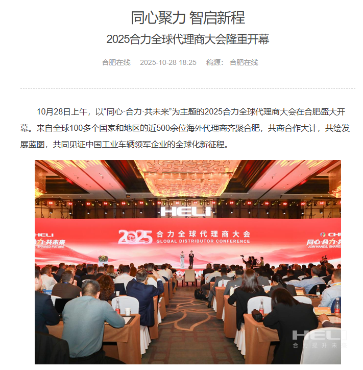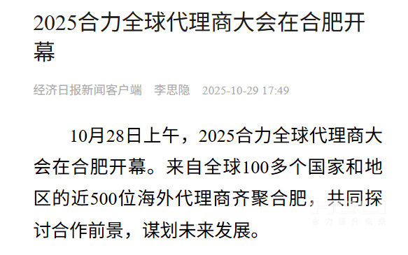 10月28日至31日,“同心?合力?共未來”2025合力全球代理商大會在合肥召開,引發(fā)媒體廣泛關(guān)注,新華社安徽分社、中央廣播電視臺安徽總站、經(jīng)濟日報、證券日報、央廣網(wǎng)、中國工業(yè)報、人民網(wǎng)安徽頻道、新華網(wǎng)安徽頻道、安徽日報、安徽新聞聯(lián)播等28家媒體、46名記者蒞臨現(xiàn)場。中央、省內(nèi)外及香港、行業(yè)媒體競相報道或轉(zhuǎn)載報道,內(nèi)容涵蓋戰(zhàn)略發(fā)布、智能成果及全球化布局,形式多元、視角鮮活,立體展現(xiàn)合力“智能+綠色”發(fā)展新動能,奏響高質(zhì)量發(fā)展強音。
