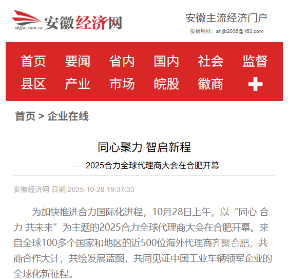 安徽經(jīng)濟網(wǎng)丨同心聚力 智啟新程——2025合力全球代理商大會在合肥開幕